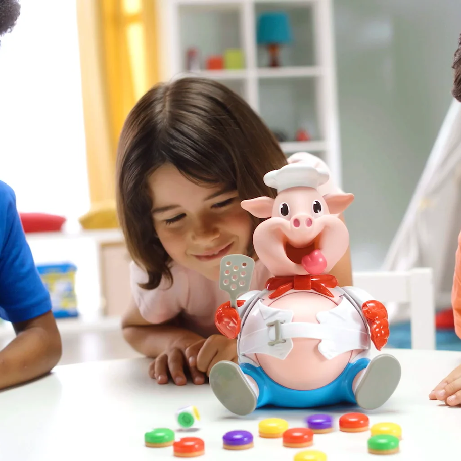 Pop the Pig is an international preschool classic that is adored by millions of children - it's been a top-selling preschool game according to data collected by NPD! Kids spin the spinner, pop a hamburger into the pig's mouth and push down on his head. The more they pump, the more his belly grows until . . . pop! Kids love the suspense as they watch his belly grow; the player who makes his belly burst wins the game. Children can quickly reset the game with one pump of the pig's head and experience consistent belly-busting gameplay each and every time. Pop the Pig provides hours of fun and is completely kid powered (no batteries needed). For added convenience, all pieces can be stored inside the pig. For 2-6 players, ages 4 and up. From the makers of Doggie Doo, Gooey Louie, Jumping Jack, Catch the Fox, and Googly Eyes.