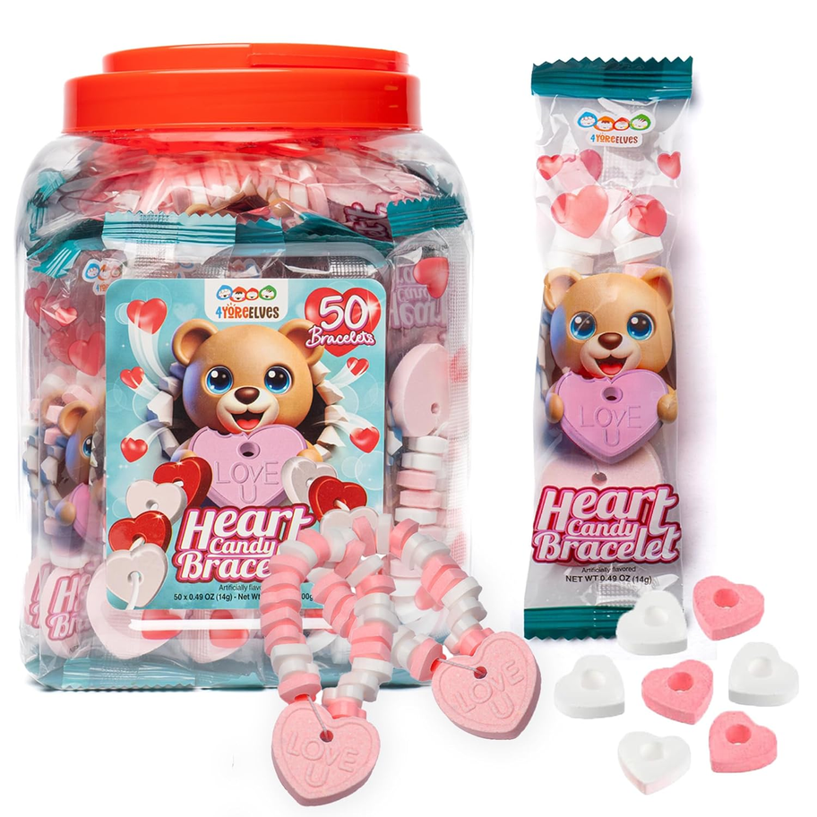 - BULK PACK: Value pack of 50 individually wrapped candy bracelets, perfect for handing out in school for Valentine’s Day or as girl's party favors. Individual bracelet weight: 0.5 oz (14 g); net weight: 24.7 oz (1.54 lb).
