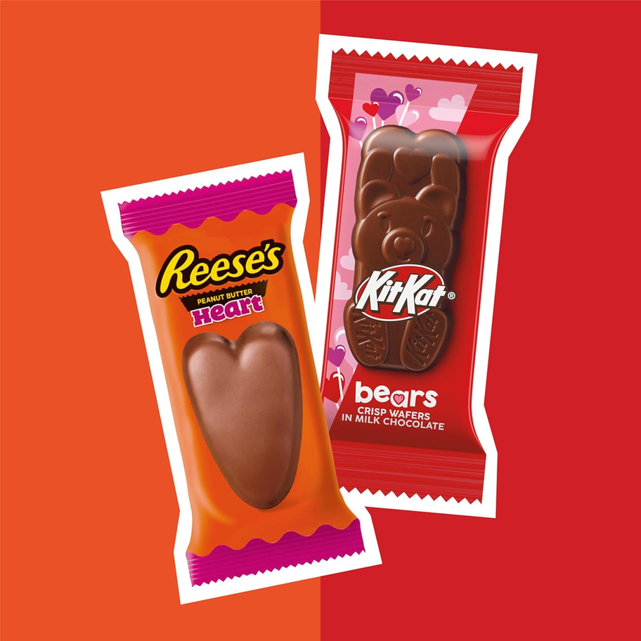 Make Valentine's Day gift giving even more exciting with assorted REESE'S and KIT KAT milk chocolate candies. Individually wrapped inside an adorned bag, this assortment includes REESE'S milk chocolate peanut butter hearts and KIT KAT milk chocolate wafer bears candies. Who wouldn't want to celebrate the holiday with scrumptious REESE'S hearts filled with peanut butter covered in milk chocolate or delicious KIT KAT wafer candy? Give a festive bag to family members, friends and colleagues to fill their day with a fun treat. Just don't forget to keep some for yourself, too!