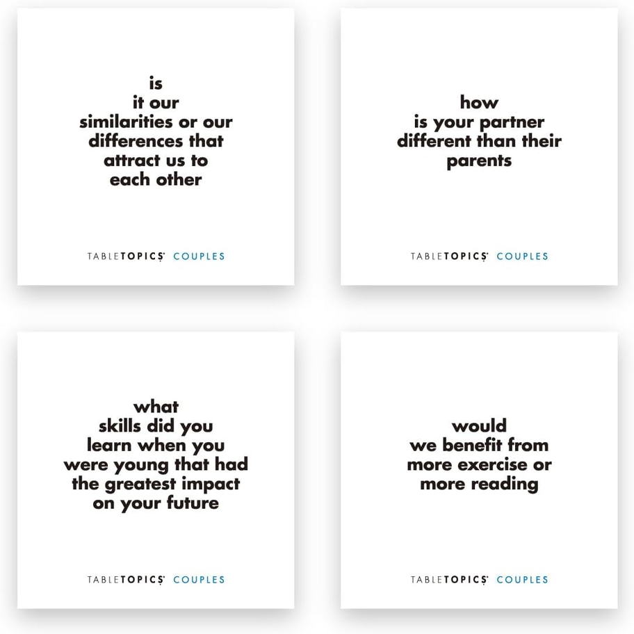 - Sample Questions: Is it our similarities or our differences that attract us to each other? What's the craziest thing we’ve ever done together? What advice would we give a younger couple?