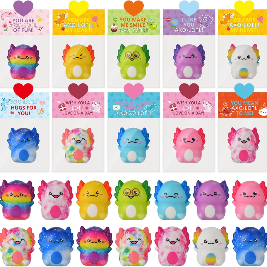 - Valentine's Axolotl Squishy Toys: Package Includes 24 Axolotl-themed Valentine’s cards in 8 adorable designs, 24 Axolotl Slow Rising toys in 10 vibrant colors. Very suitable as a Valentine's Day gift for school classrooms, allowing children to express care and gratitude.