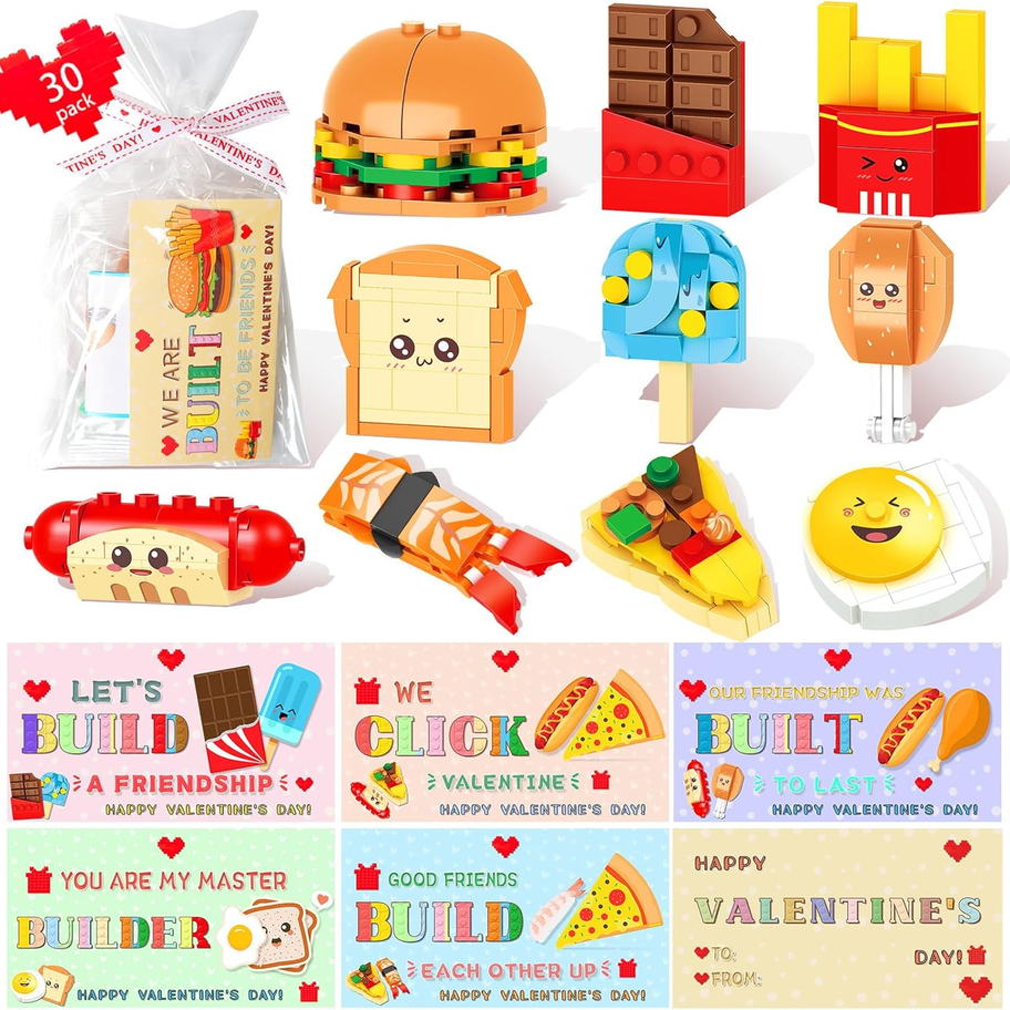 - ๐VALENTINE'S DAY BLOCK SET: Our Valentine's Day gift set for kids includes 30 packs of blocks, 30 cards, and 30 bags. 30 Valentine's Day Ribbons.10 different food blocks: burger, chocolate, fries, pizza, salmon sushi, chicken thighs, hot dog, fried egg, toast, popsicle. Each mini block has matching colorful instructions that are easy to understand and easy to build.